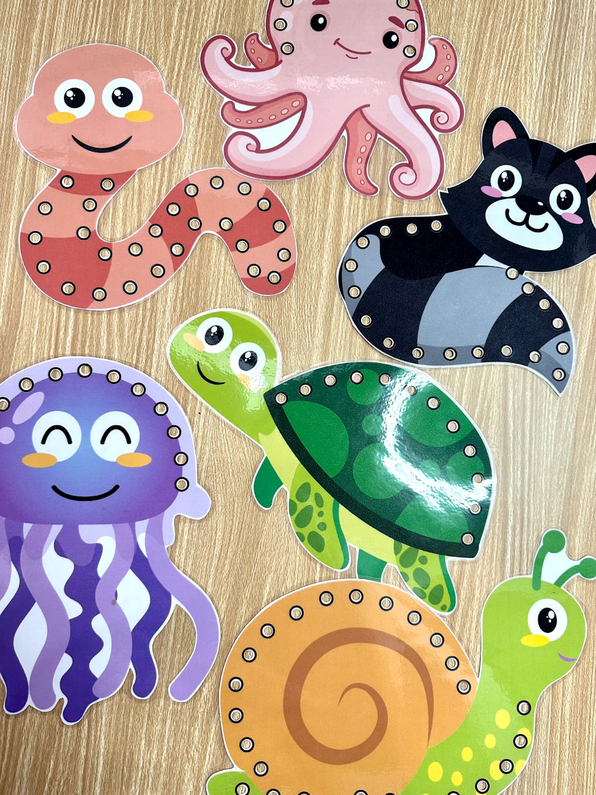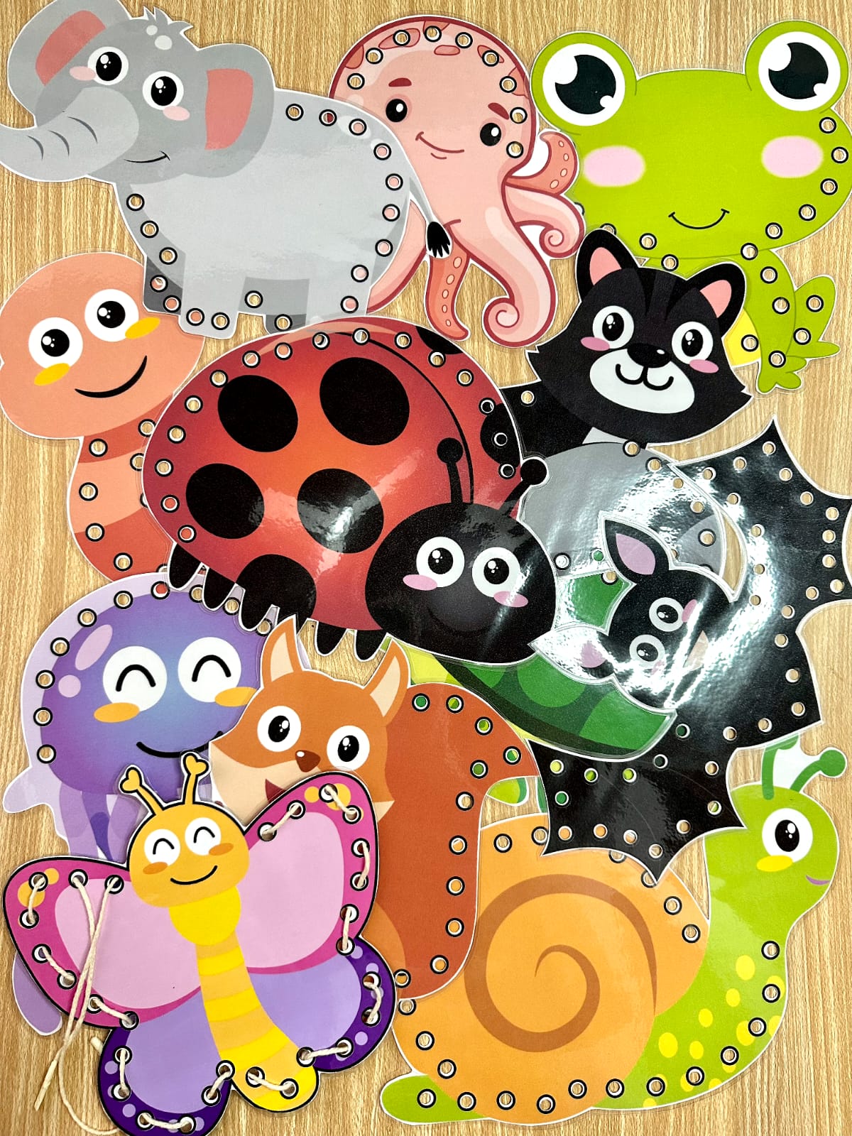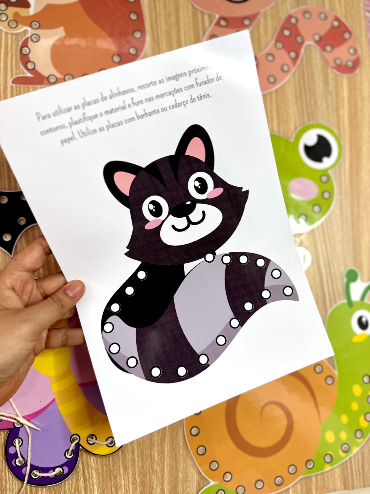 O Alinhavos dos Animais é um recurso educativo perfeito para potencializar o desenvolvimento motor das crianças de forma lúdica e divertida! Com 12 ilustrações de animais diferentes, este material estimula a coordenação motora fina através da movimentação que a criança precisa fazer ao passar o barbante pelos furos da figura, explorando movimentos de precisão.