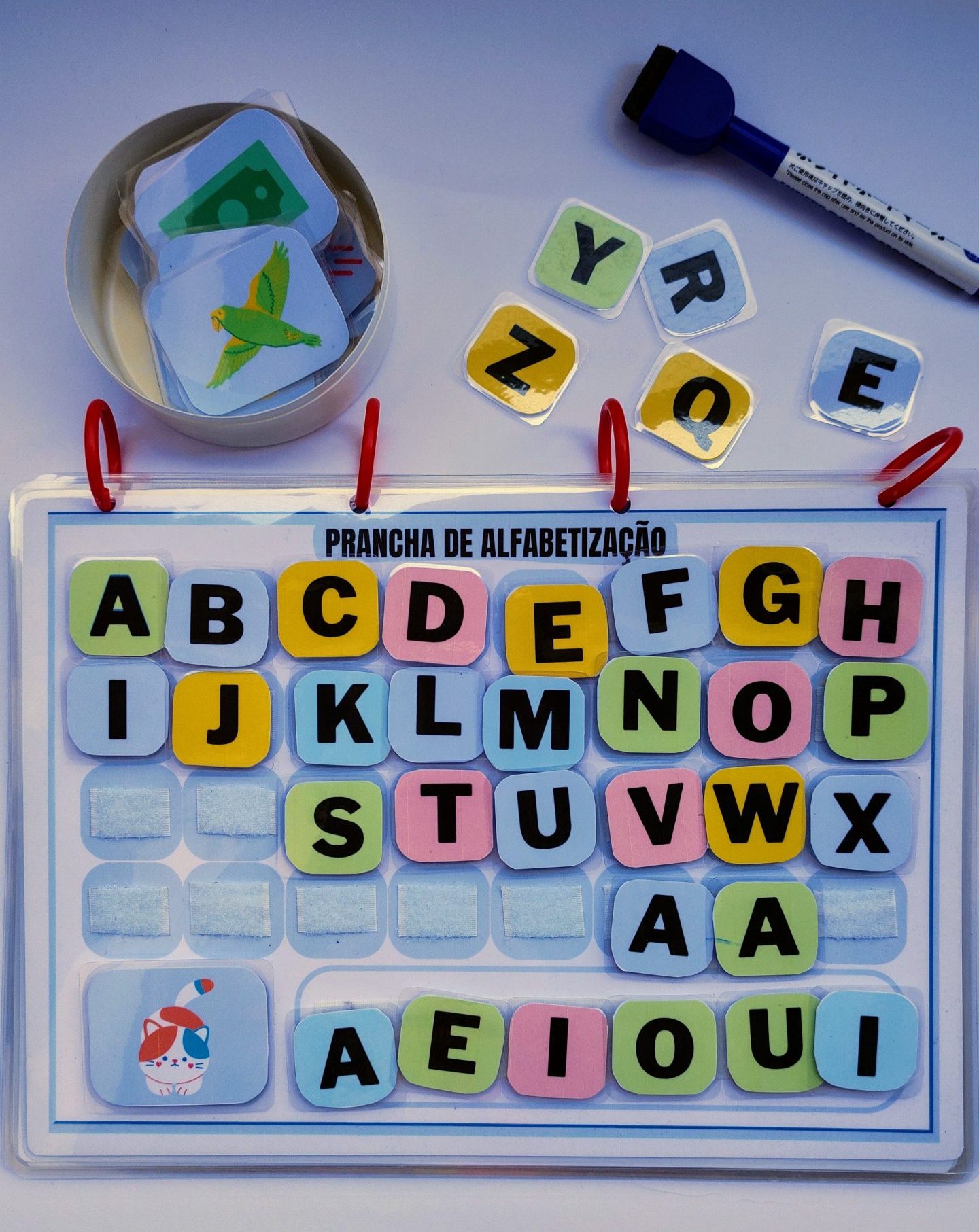 Quais são os jogos? PRANCHA DO ALFABETO, PRANCHA CONSTRUINDO AS PALAVRAS, KIT ATIVIDADES COM AS VOGAIS COM JOGO, BINGO E ENCONTRE A VOGAL, ALFABETO TRACEJADO, PRANCHAS PARA COMPLETAR OS NÚMEROS E QUANTIDADES E QUANTIFICAÇÃO DE ELEMENTOS.