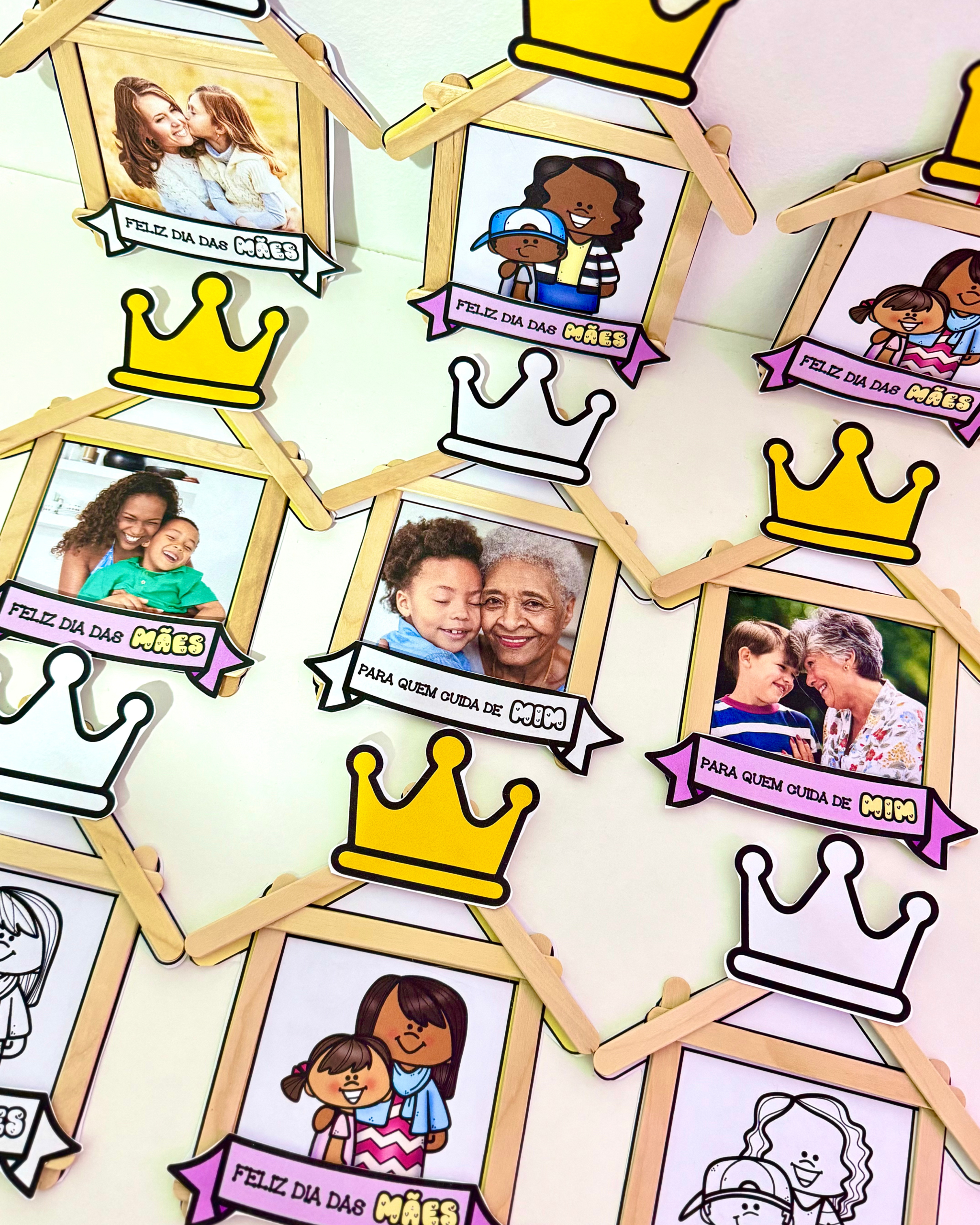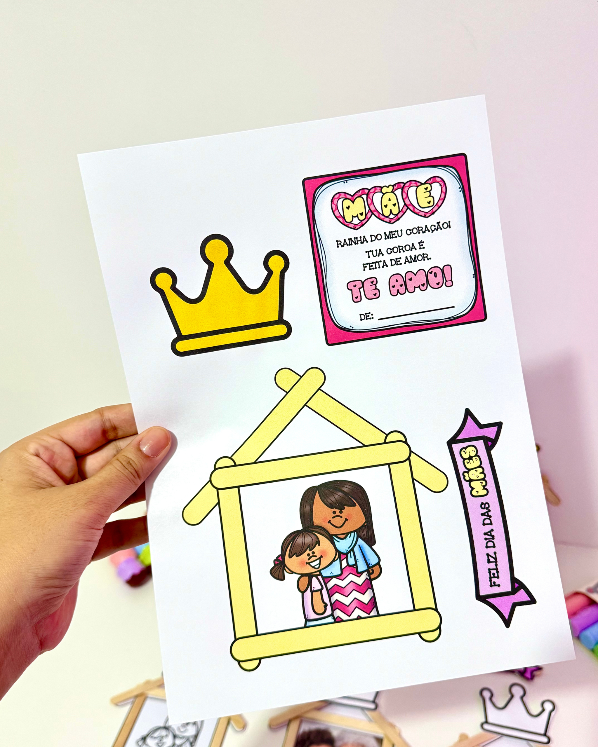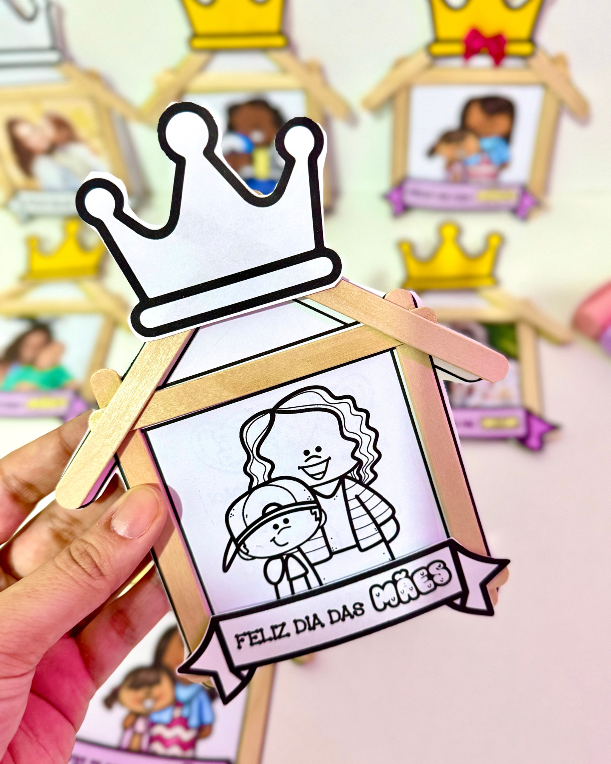 Ideia com foto para trabalhar com muito carinho o tema Dia das Mães (ou “Dia da família” ou o “Dia de quem cuida de mim”) com as turmas da Educação Infantil. Com as mãozinhas das crianças participando, sua criatividade e protagonismo permitiremos que montem uma lembrança especial com palitinhos de picolé, utilizando elementos visuais e simbólicos que reforçam o vínculo com a figura materna ou com quem cuida delas no dia a dia.