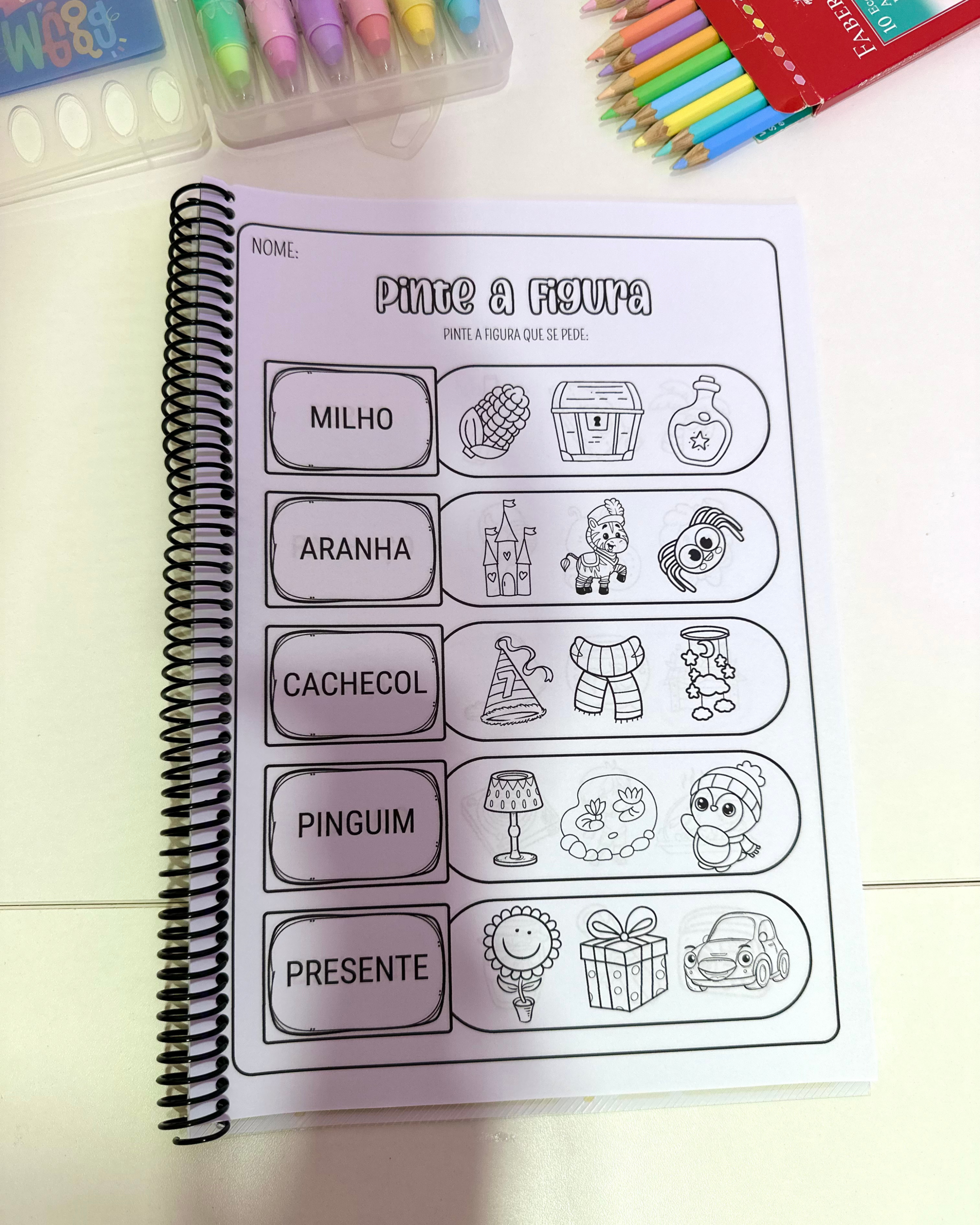 Apostila para turmas em fase de alfabetização, com foco no trabalho das sílabas complexas de forma lúdica e visual. Nesta proposta, a criança é convidada a realizar a leitura da palavra e identificar a figura correspondente, pintando a imagem correta. Um recurso simples, mas muito eficaz para estimular a leitura, a associação entre texto e imagem, e o desenvolvimento da atenção.