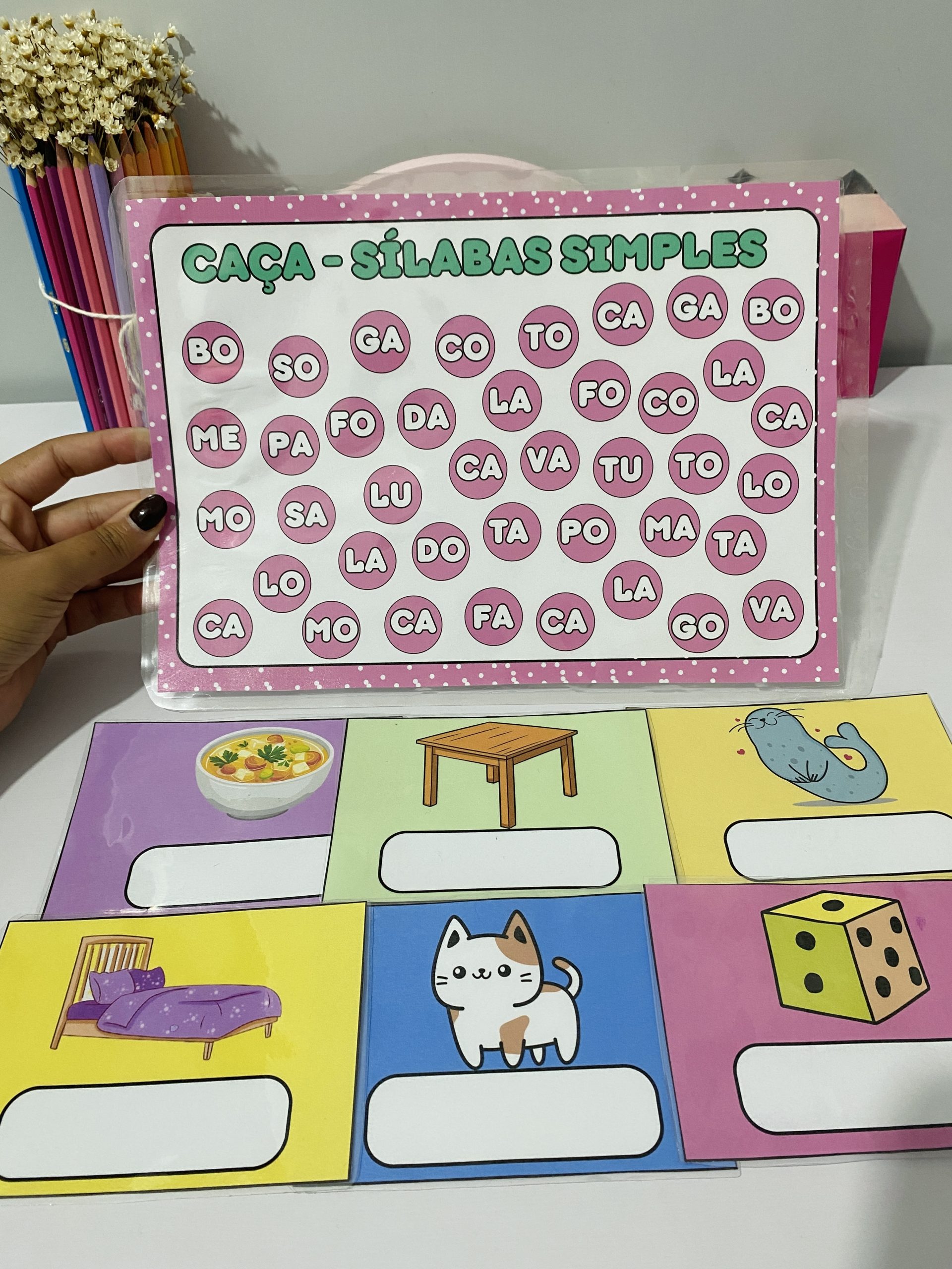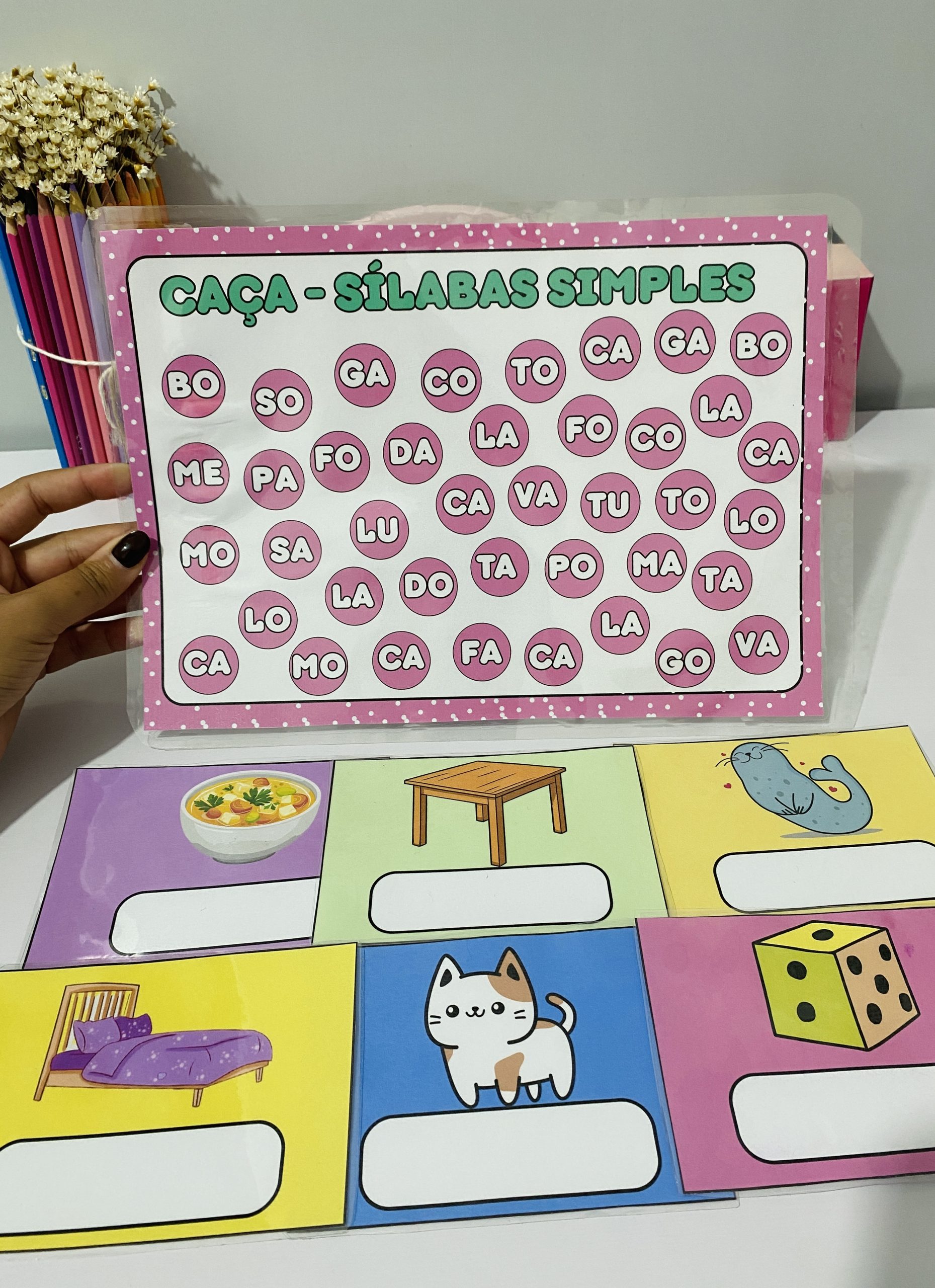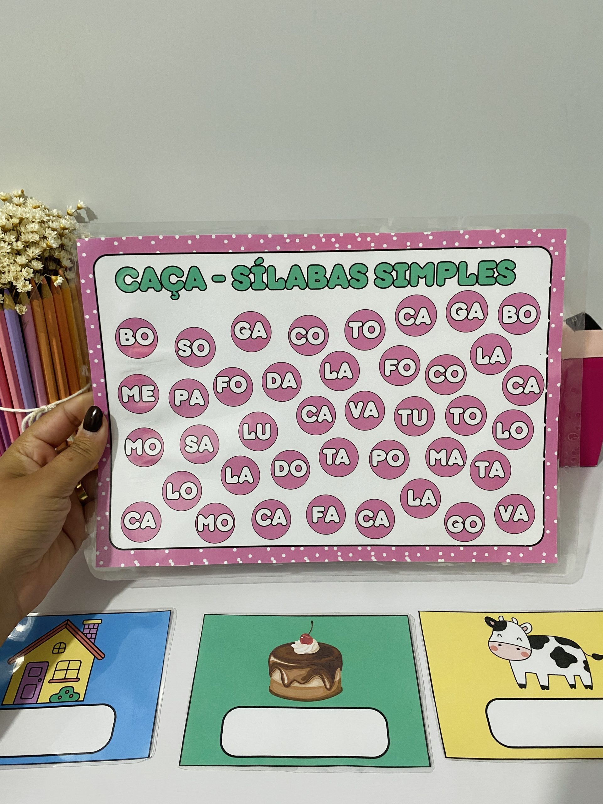 Nessa atividade, as sílabas foram repetidas intencionalmente para garantir que a criança encontre todas com facilidade, sem precisar repetir marcações. Isso reforça a memorização, a fluência da leitura e o reconhecimento visual das sílabas.