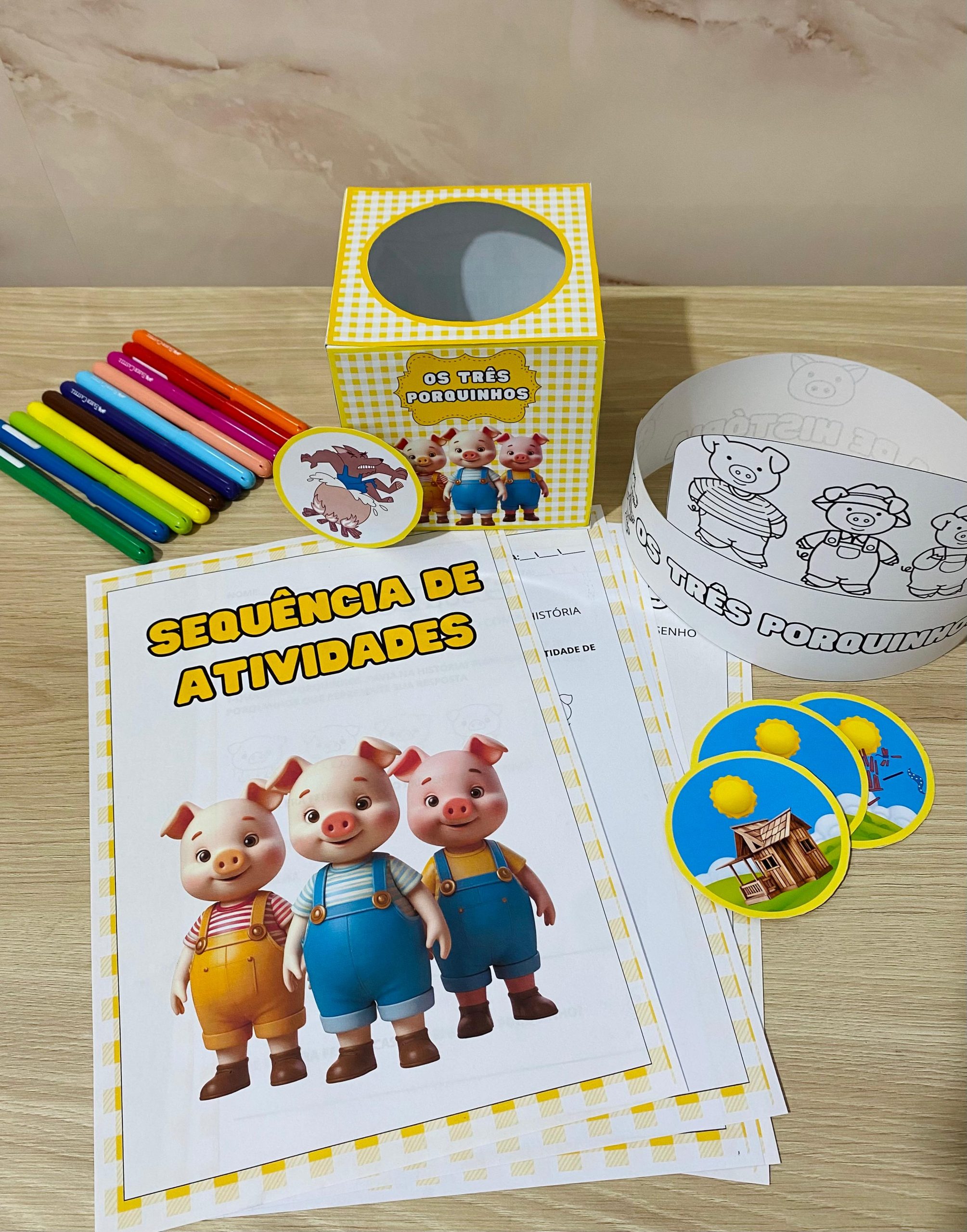 • Atividades de interpretação, desenho, labirinto, pontilhado e pintura das casas dos porquinhos