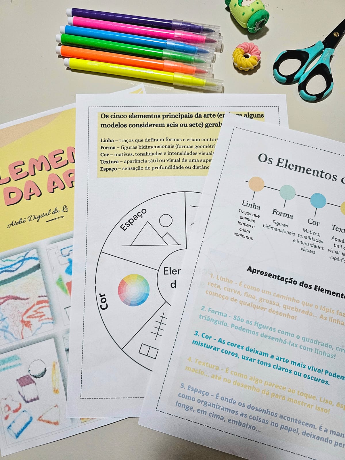 Este material foi desenvolvido especialmente para professoras do Ensino Fundamental que desejam trabalhar os elementos da arte de forma prática, clara e envolvente em sala de aula.