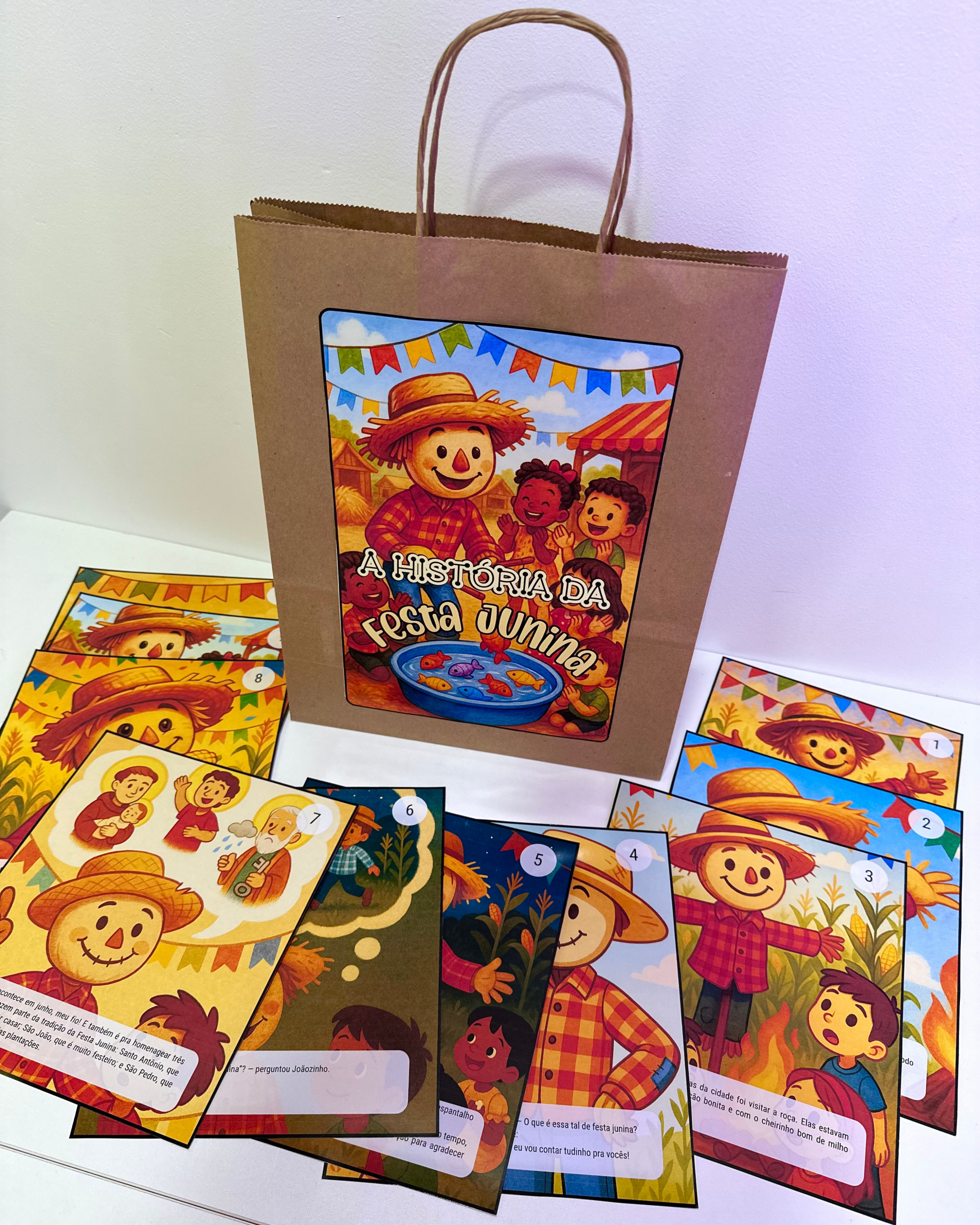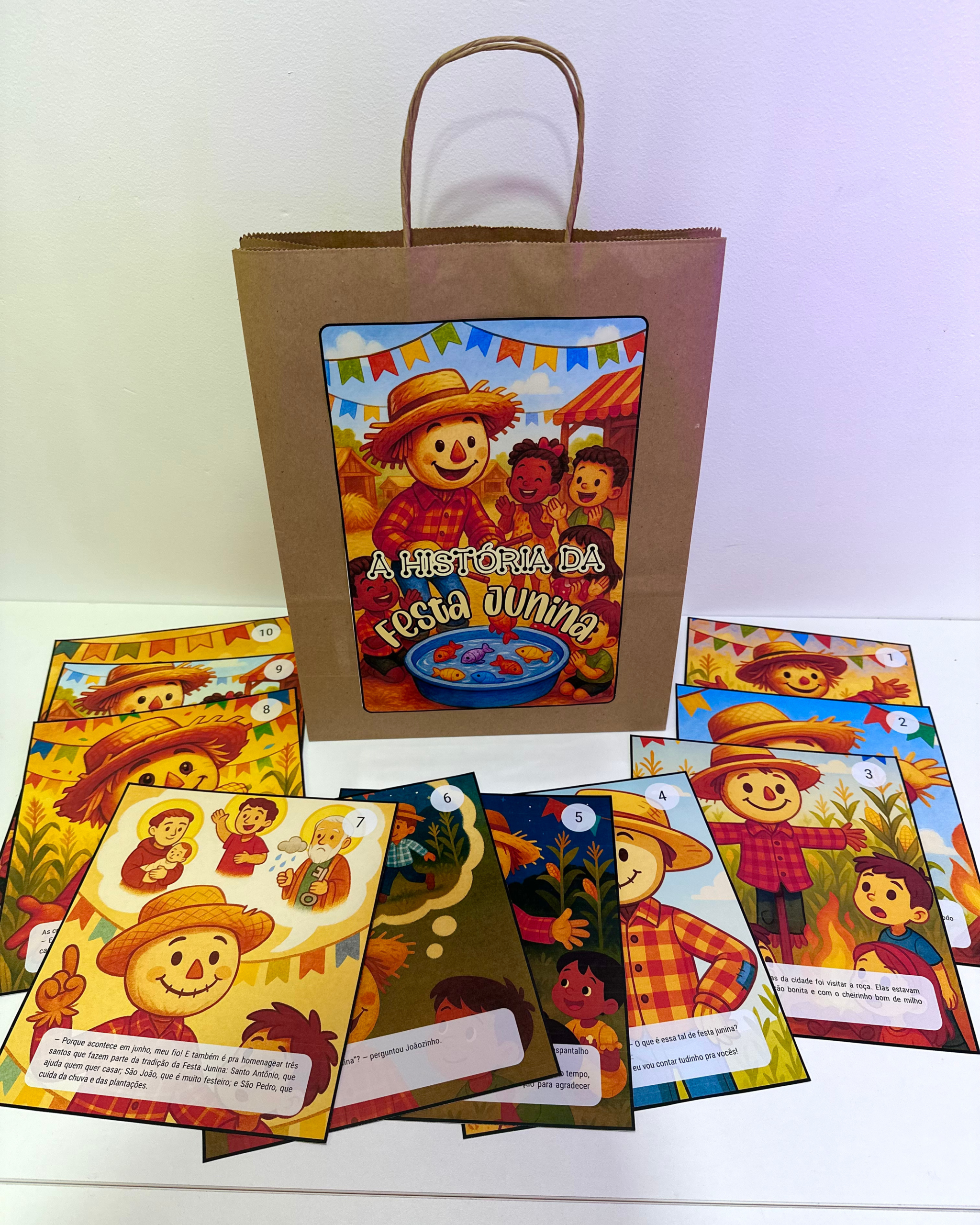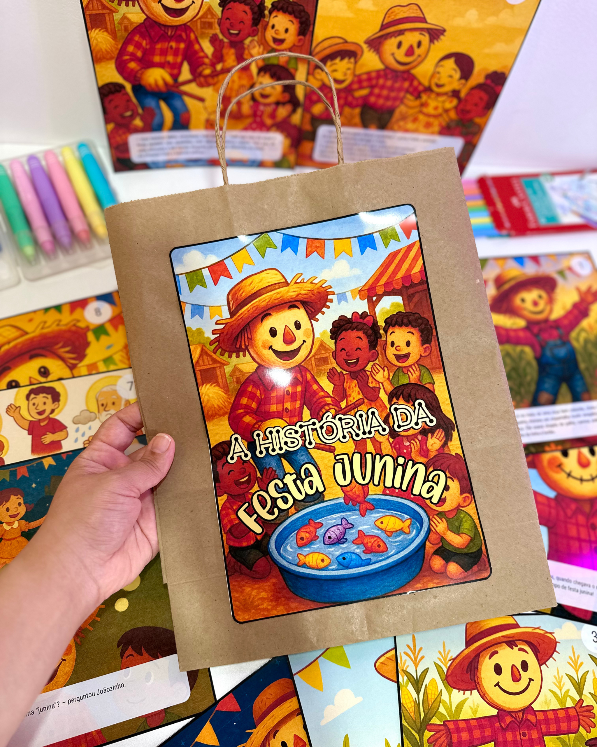 Além da história, você recebe também a arte da capa da sacola, pronta para impressão e montagem, facilitando o uso e tornando a atividade ainda mais divertida.