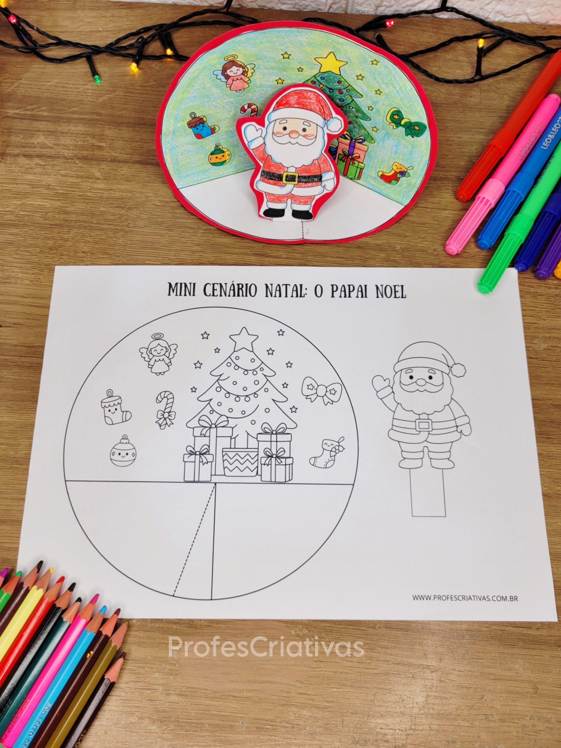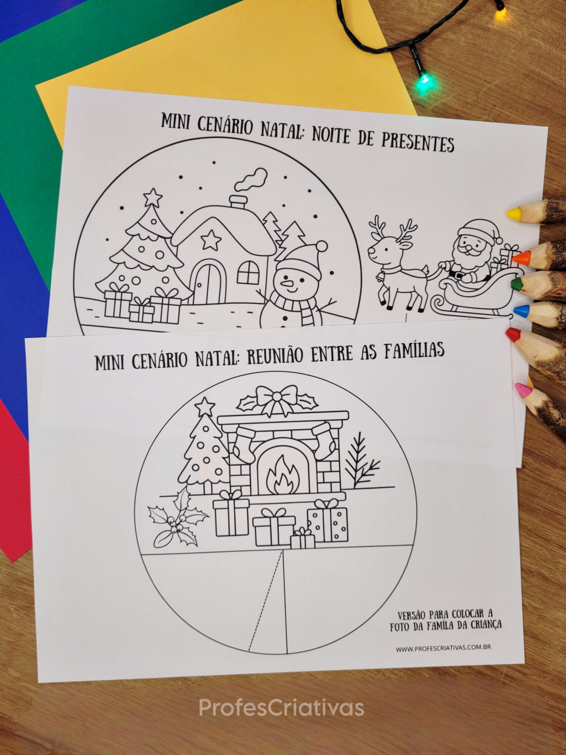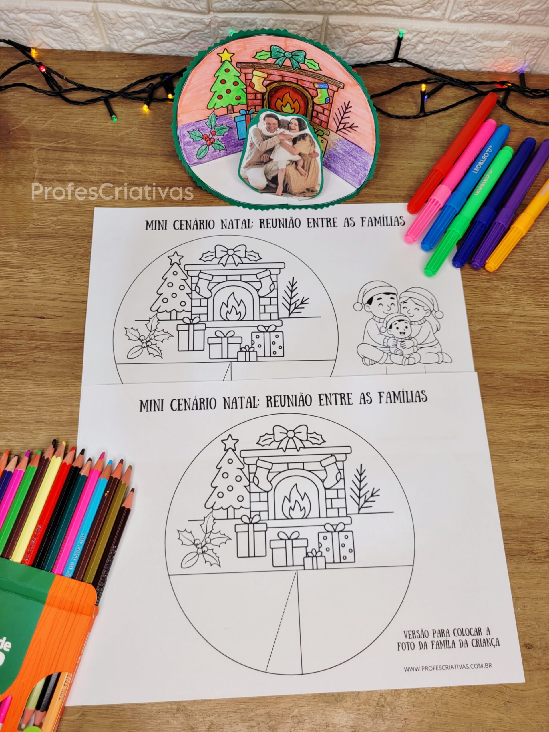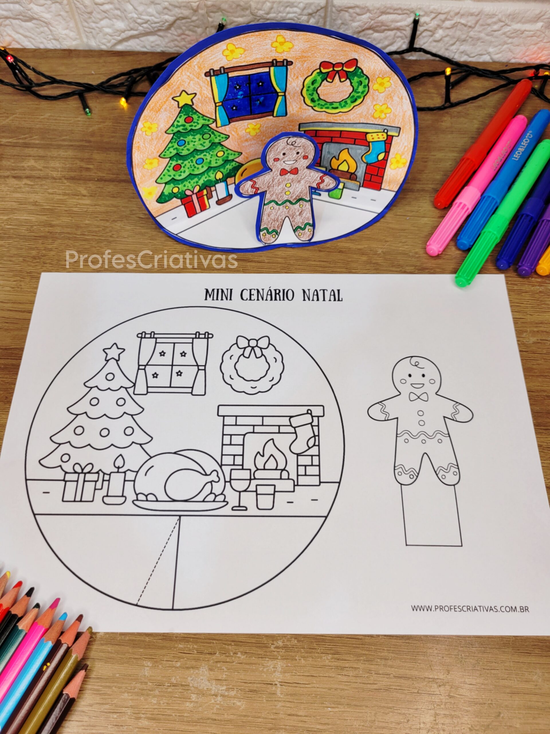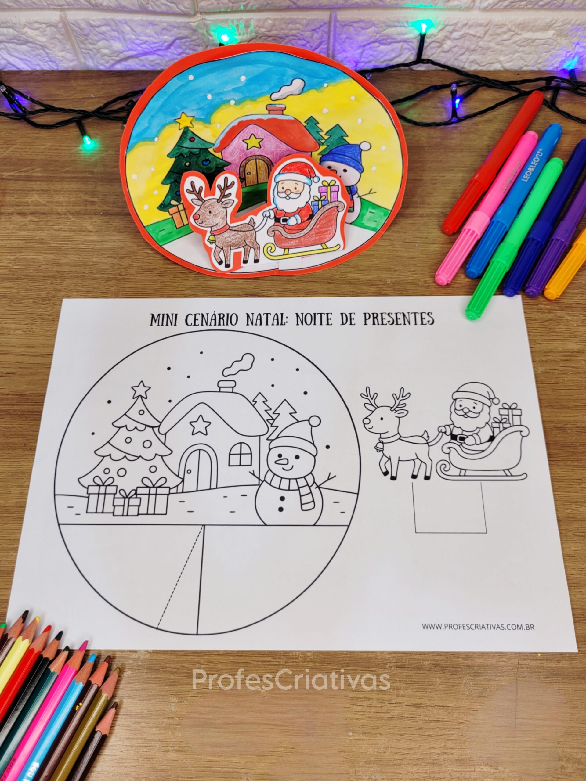 O material propõe uma experiência artística e afetiva em que as crianças pintam, recortam e montam pequenas cenas que representam diferentes momentos e símbolos do Natal — como o Papai Noel, a noite de presentes, as famílias reunidas, a ceia e o boneco de neve.