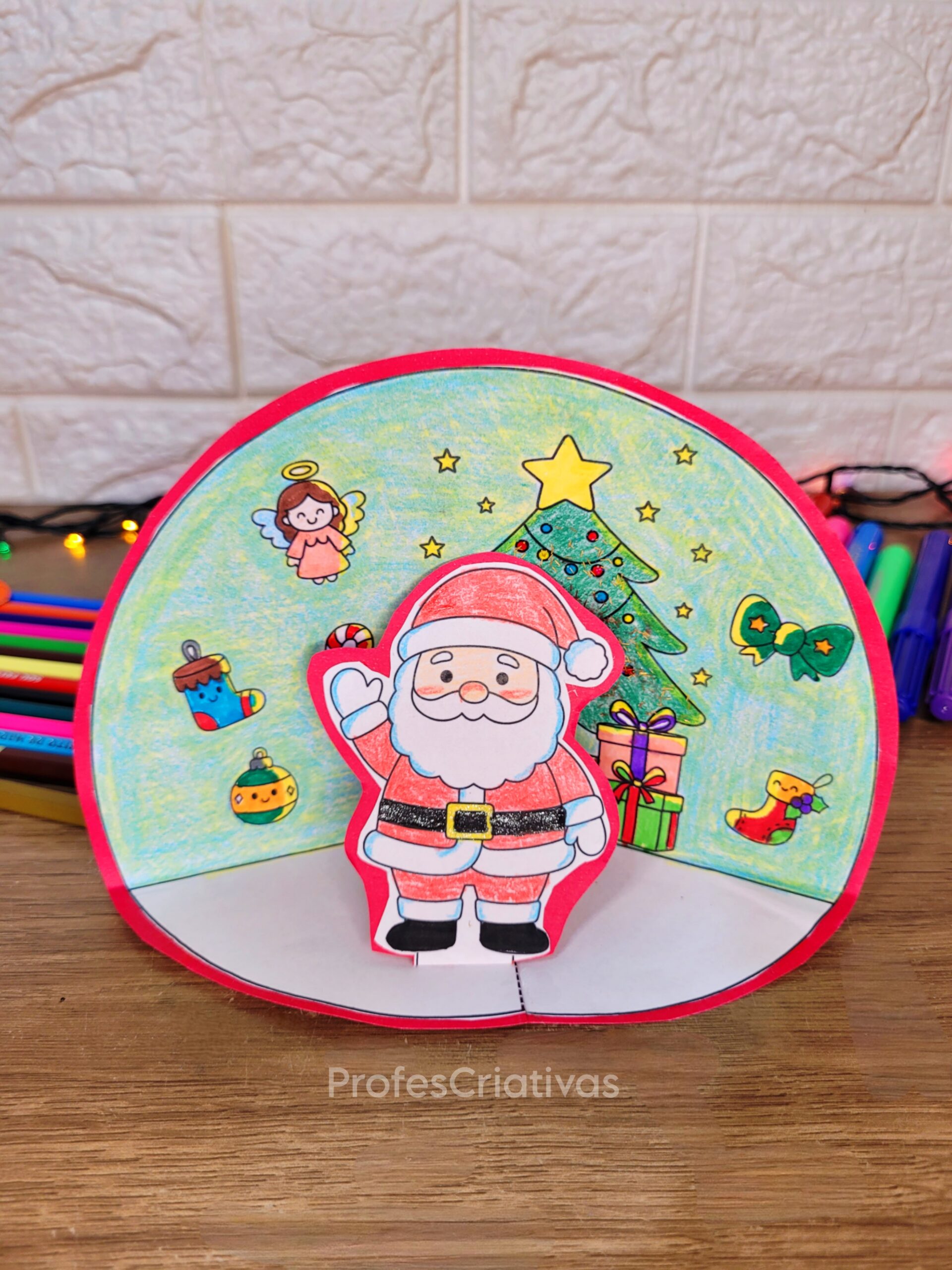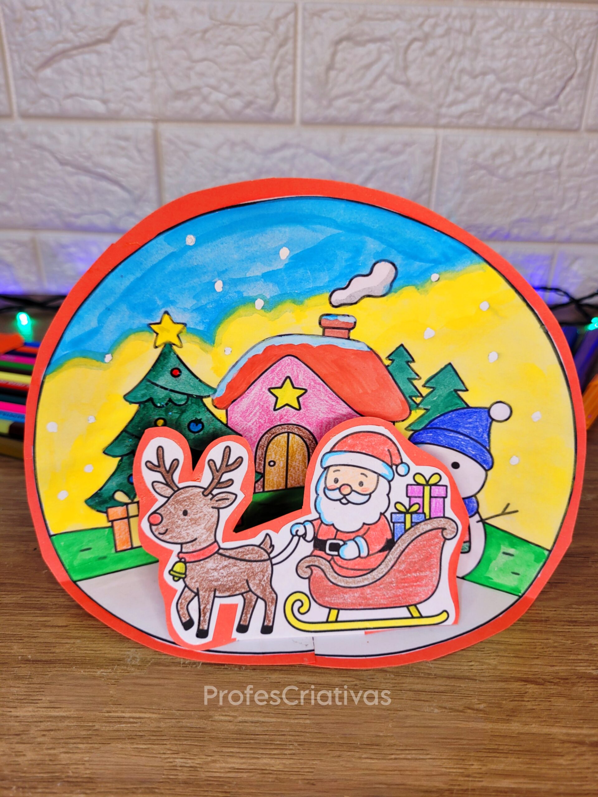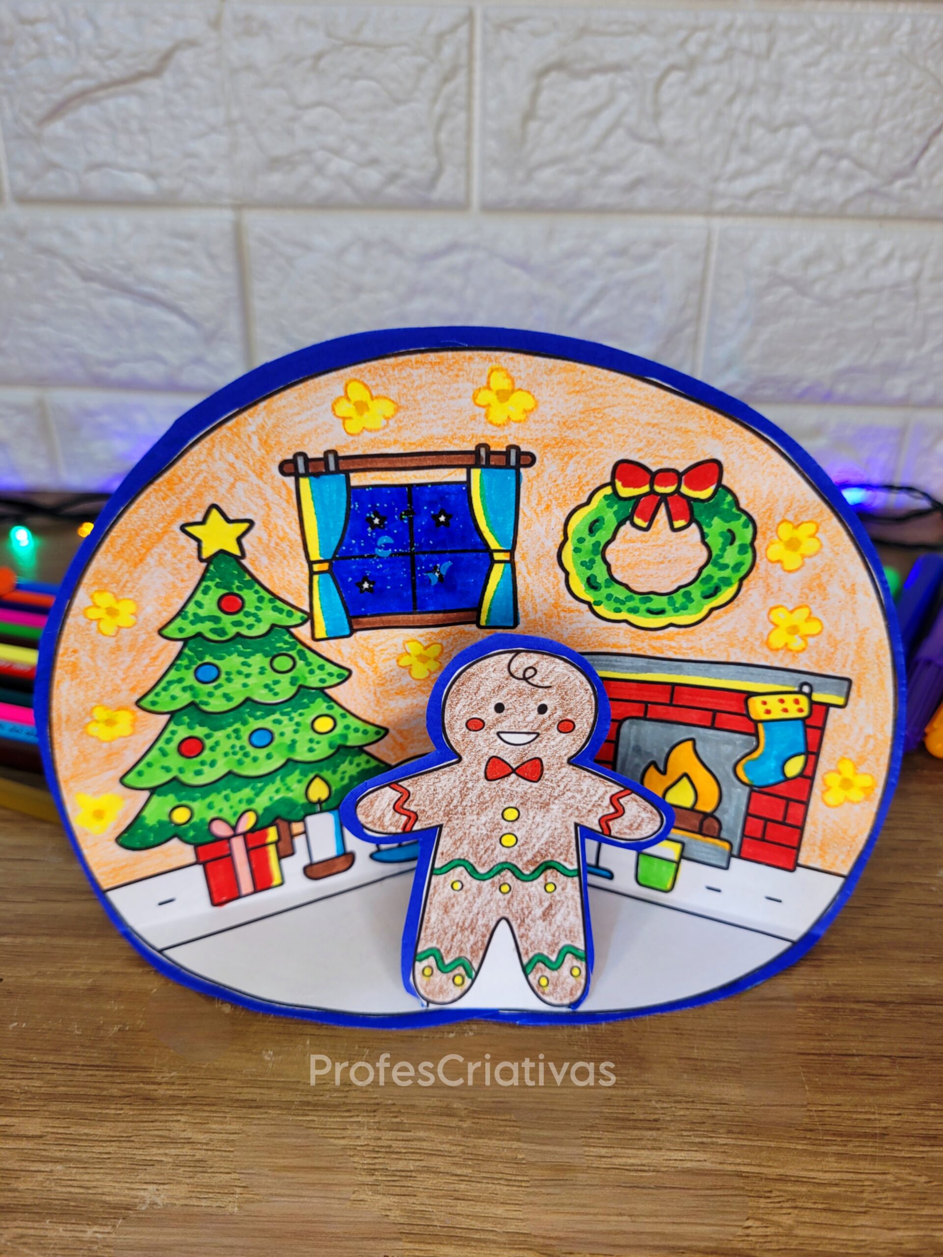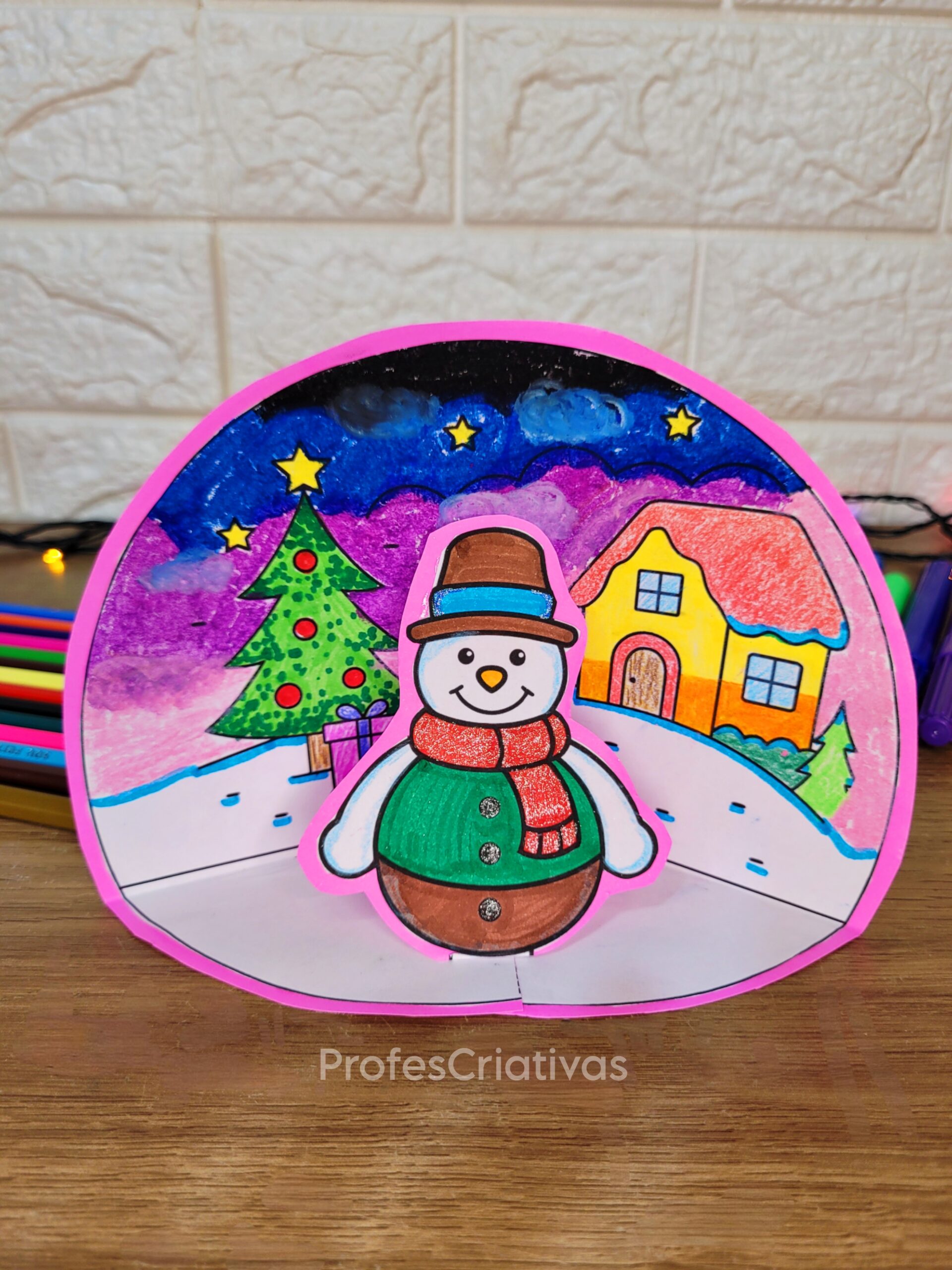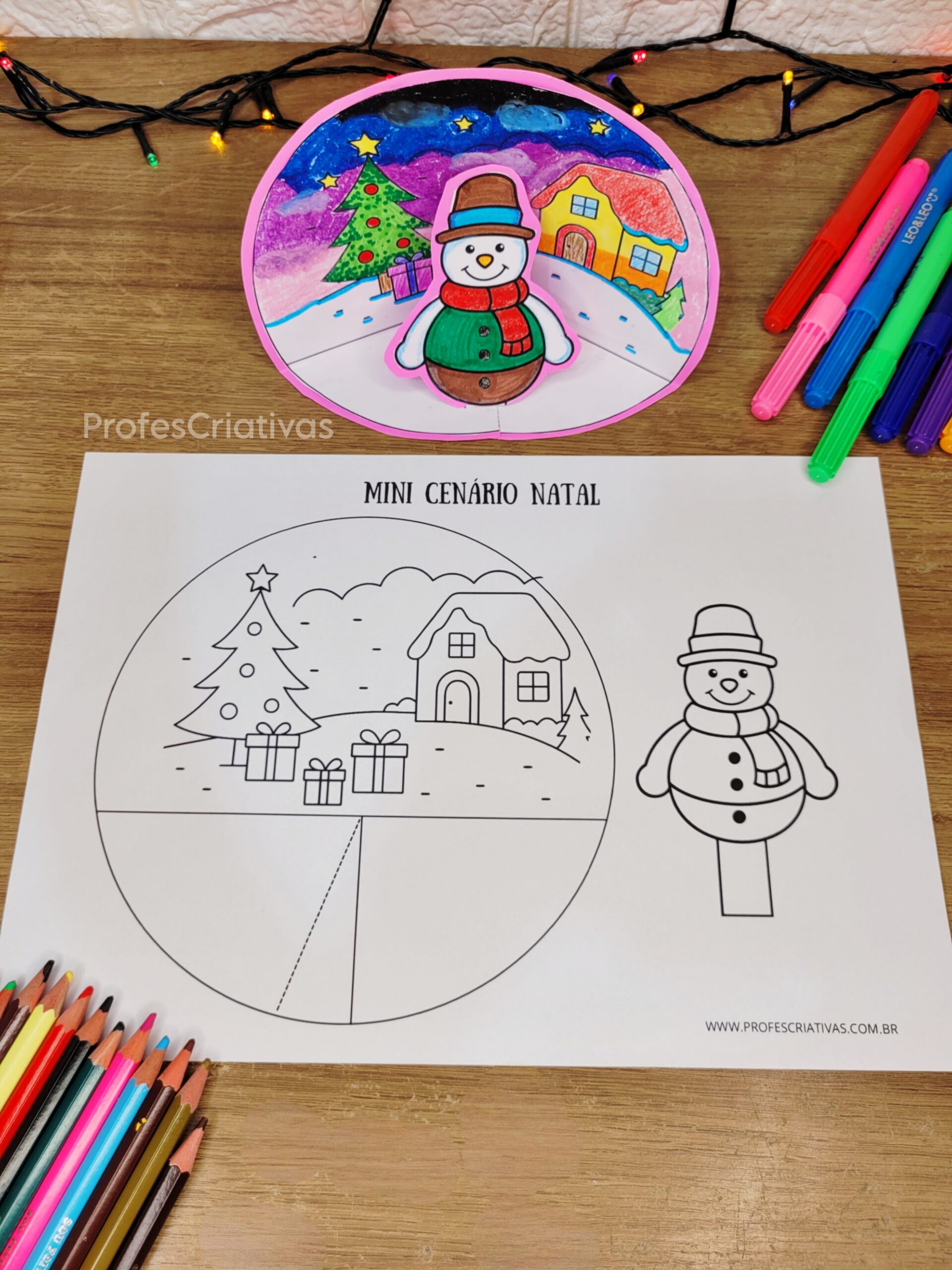 O material propõe uma experiência artística e afetiva em que as crianças pintam, recortam e montam pequenas cenas que representam diferentes momentos e símbolos do Natal — como o Papai Noel, a noite de presentes, as famílias reunidas, a ceia e o boneco de neve.