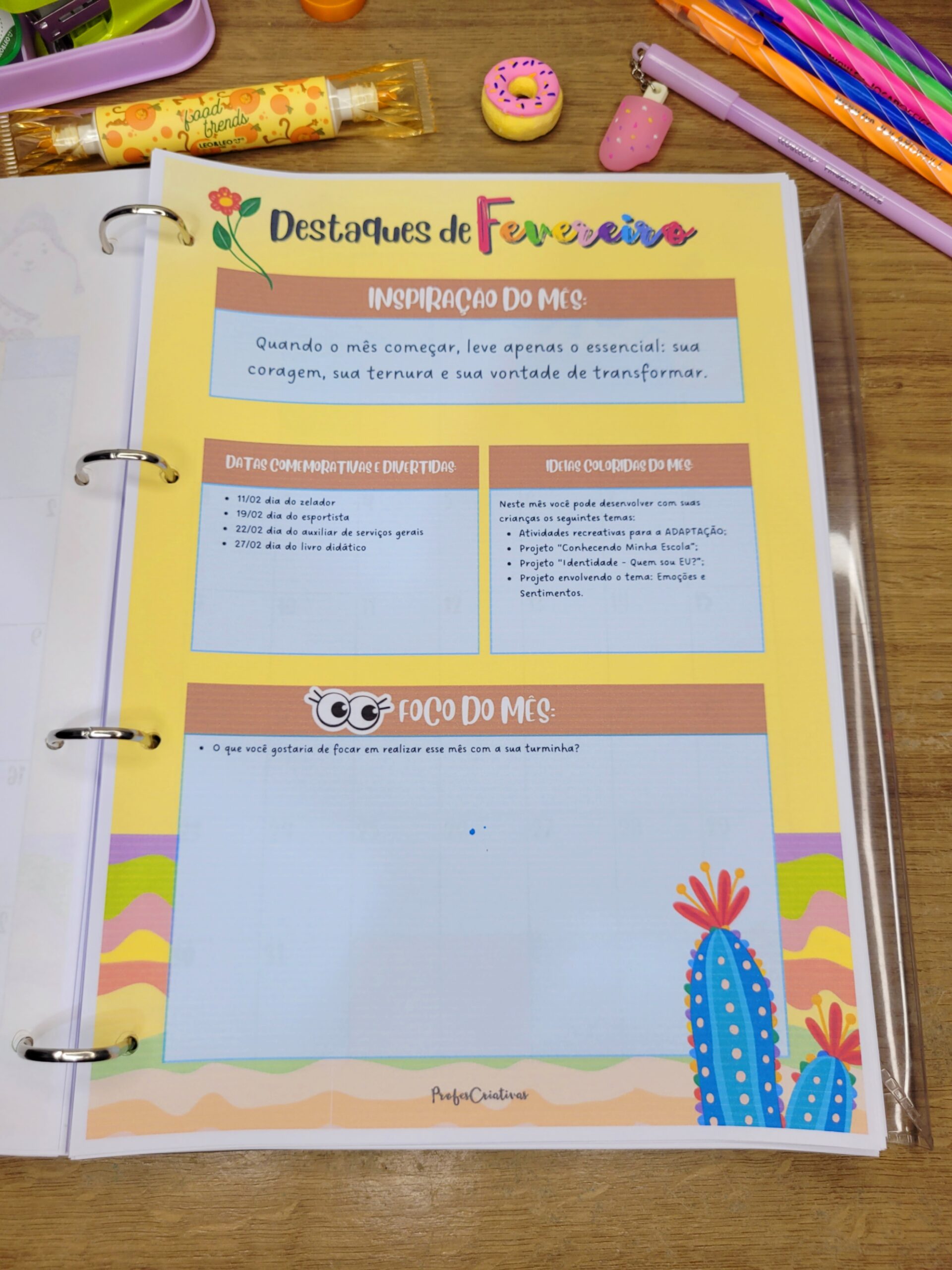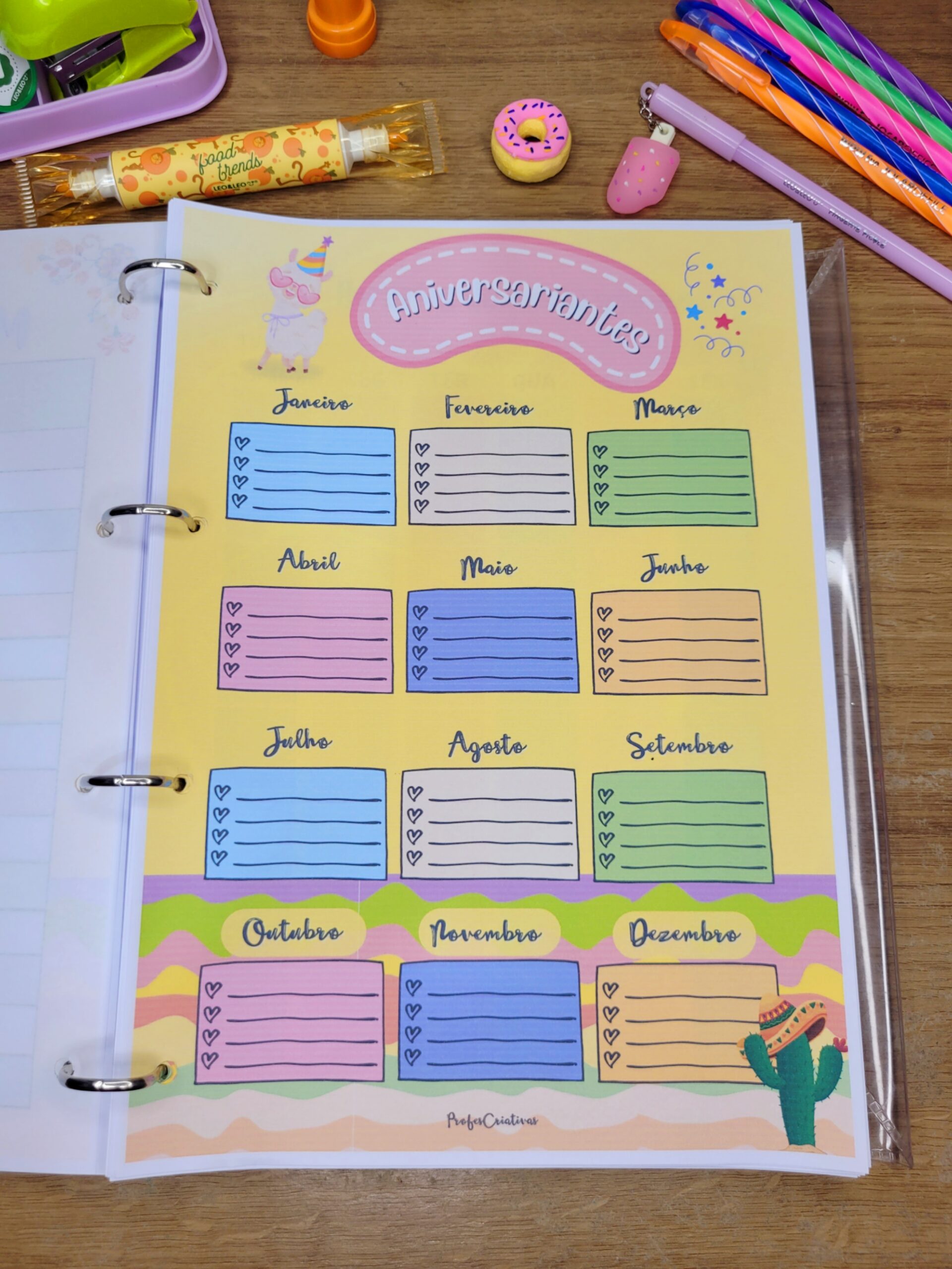 Além disso, você recebe divisórias para escolher como deseja organizar seu ano: bimestral, trimestral ou semestral.