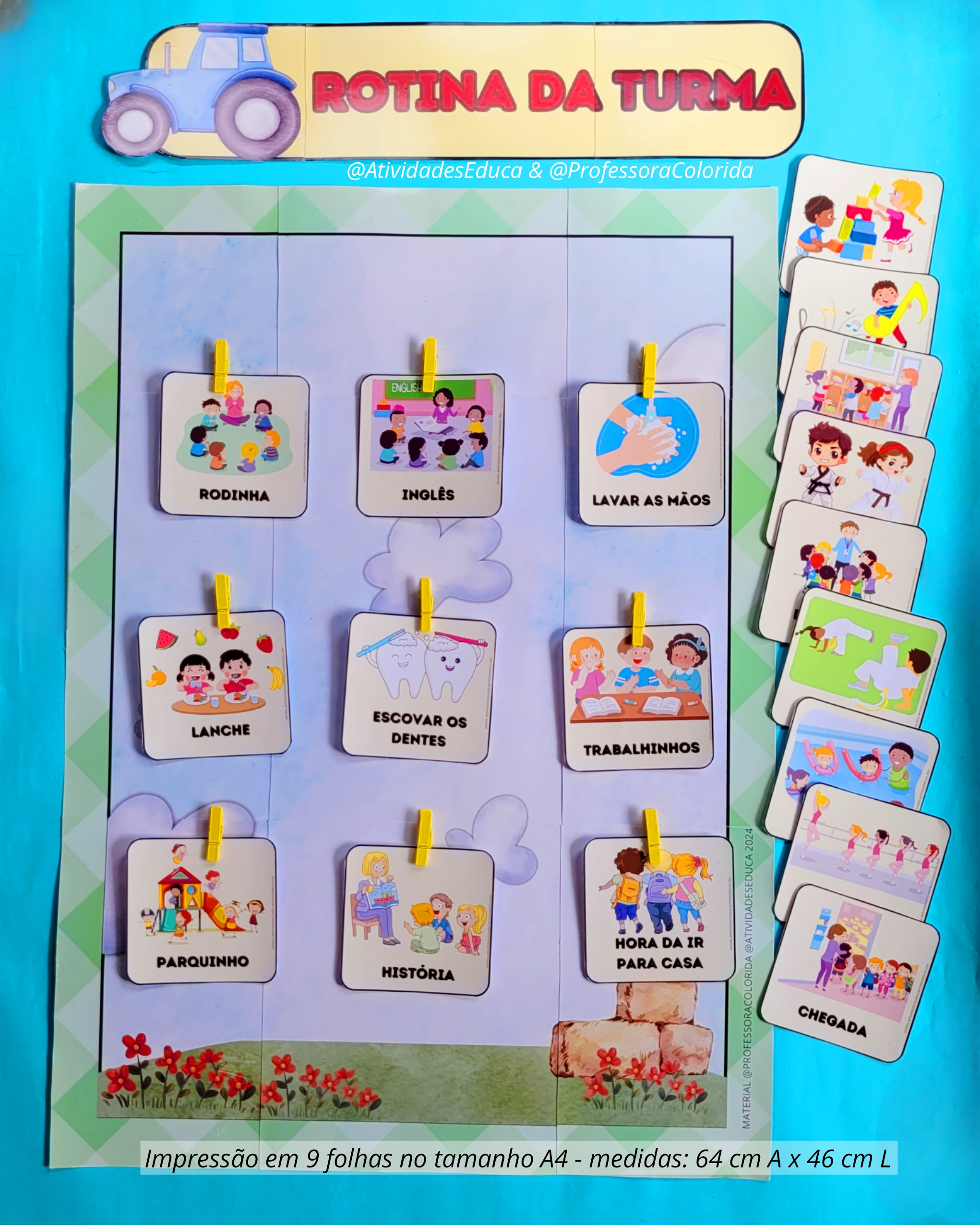 Você terá acesso aos arquivos do CARTAZ ROTINA DA TURMA AMPLIADO que ao todo possui 17 páginas. O cartaz vem repartido em 9 folhas de tamanho A4 (como um grande quebra-cabeça), após montar ele ficará com as seguintes proporções: 64 cm de altura por 46 cm de largura. E contém 18 plaquinhas para sinalização do momento da rotina. As plaquinhas da rotina estão em duas versões, uma com a descrição do momento da rotina em letra BASTÃO. Outra apenas com a ilustração, na foto do cartaz você conseguirá ver.