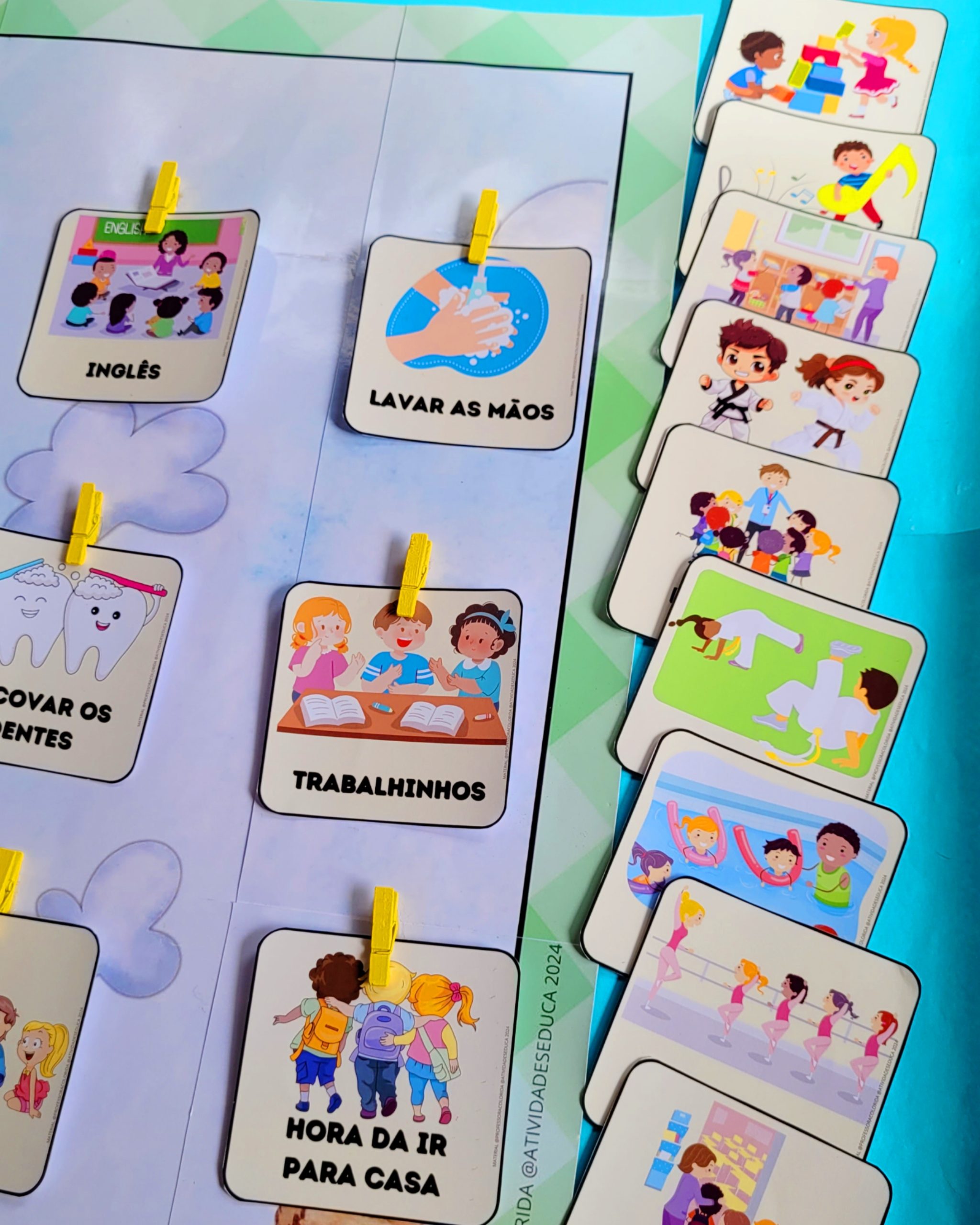 🌟 Dicas especiais : O material pode ser impresso em qualquer tipo de papel. Porém, se você deseja ter um material com cores mais vivas e com um tempo maior de durabilidade recomendamos que prefira usar papel fotográfico (glossy ou matte) de 180gm. Também use uma película de papel contact transparente para proteger das mãozinhas que estarão em contato diariamente com o cartaz. Os pequenos cards podem ser plastificados. E para colar e descolar os elementos pode ser usado velcro adesivo.