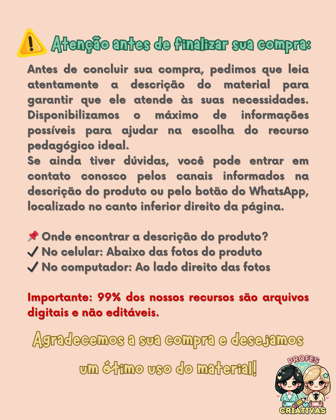 Por gentileza, o Whatsapp é apenas para suporte (dúvidas sobre o material ou sobre compras, problemas com o acesso, perda de material e etc). Realize sua compra aqui no site. Fizemos o PROFESCRIATIVAS.COM.BR com muito carinho e segurança para que você tenha autonomia em adquirir seus materiais.